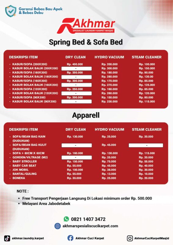 Kami juga menerima jasa cuci kasur, cuci spring bed, cuci sofa / sofabed, cuci beanbag, cuci gordyn, dan cuci laundry lainnya.